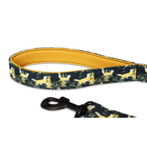 Smycz wykonana jest z mocnej taśmy nośnej obszytej tkaniną wodoodporną. Tkanina, którą obszyta jest smycz jest łatwa w czyszczeniu i na długi czas zachowuje swój niepowtarzalny wygląd.